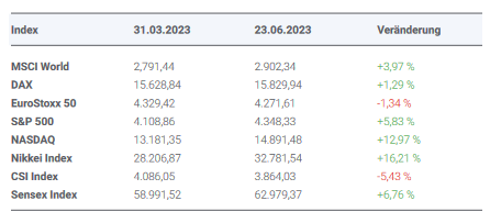 Die Zinserhöhungen der westlichen Notenbanken wurden fortgesetzt. Die EZB reduzierte die Zinsschritte von zuvor 0,50% auf 0,25% (aktuell 4,00%). Die US-Notenbank verzichtete bei der jüngsten Sitzung des Offenmarktausschusses auf einen Zinsschritt, verwies aber darauf, dass zwei weitere Schritte bis Jahresende folgen könnten (aktuell 5,00% – 5,25%). Die Bank of England sah sich wegen hartnäckigen Inflationsdrucks genötigt, den Leitzins im Juni um 0,50% auf 5,00% zu erhöhen, während die Notenbank Japans weiter auf Zinserhöhungen verzichtet (-0,10%).